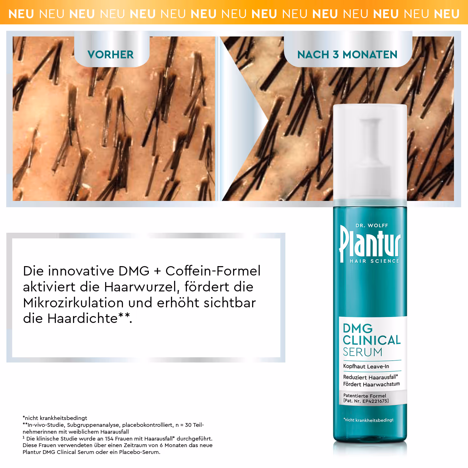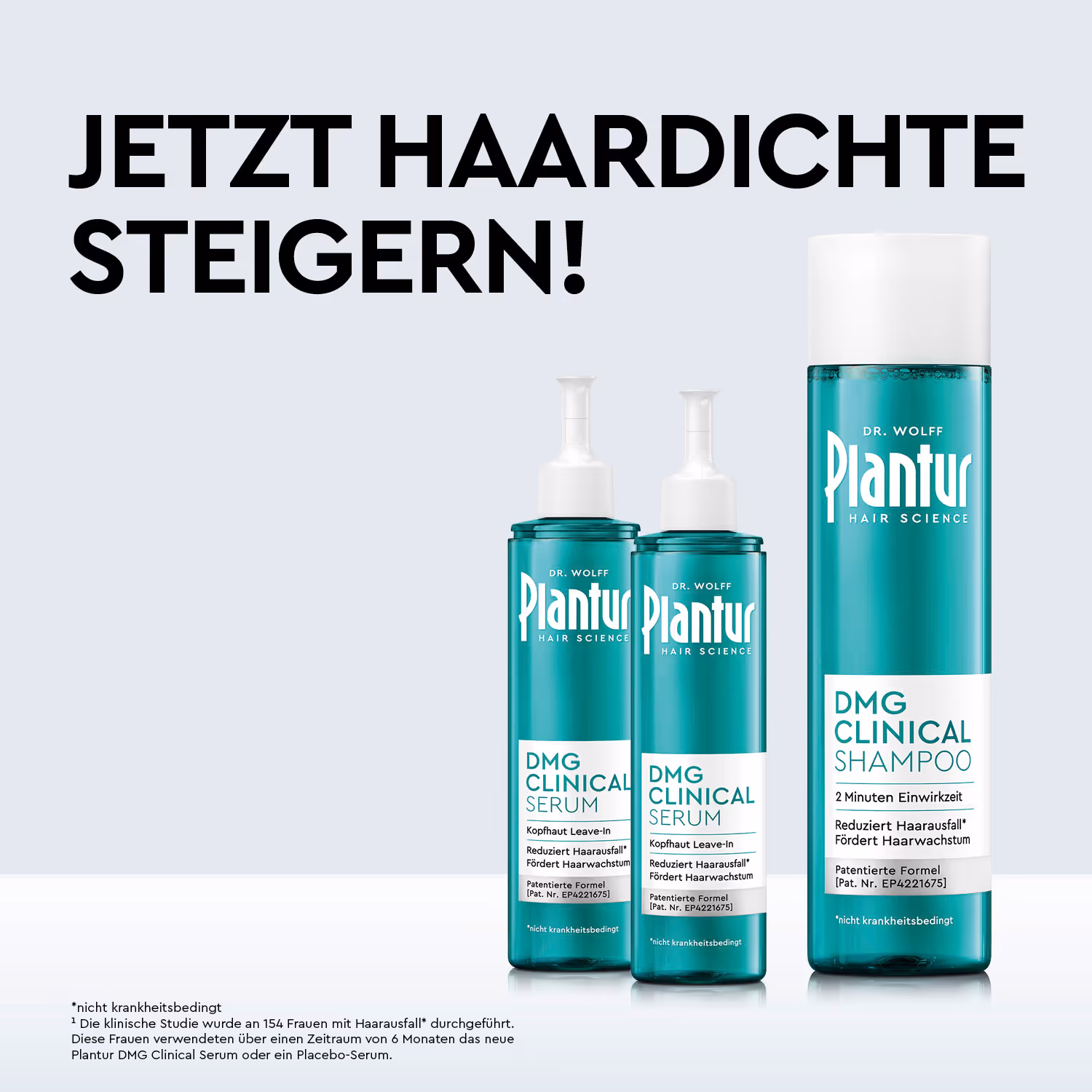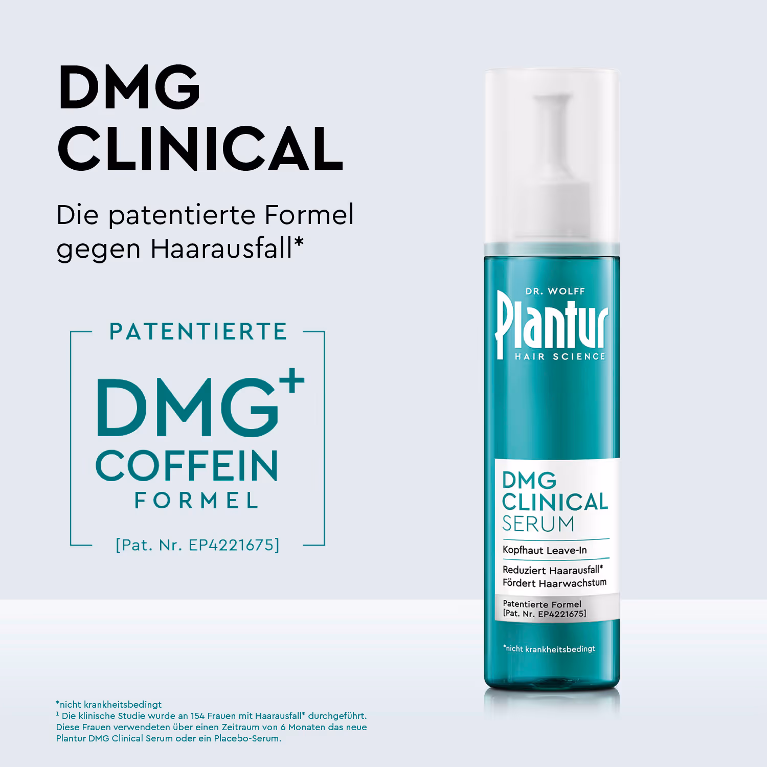¹ Die klinische Studie wurde an 154 Frauen mit Haarausfall* durchgeführt. Diese Frauen verwendeten über einen Zeitraum von 6 Monaten das neue Plantur DMG Clinical Serum oder ein Placebo-Serum.