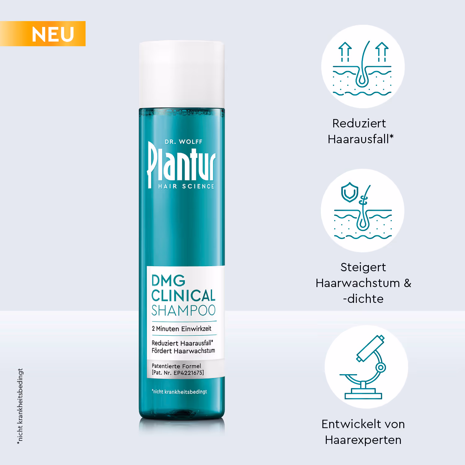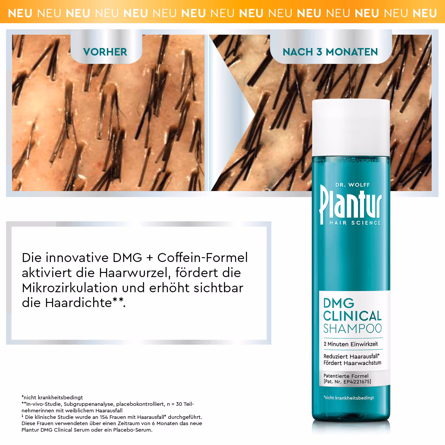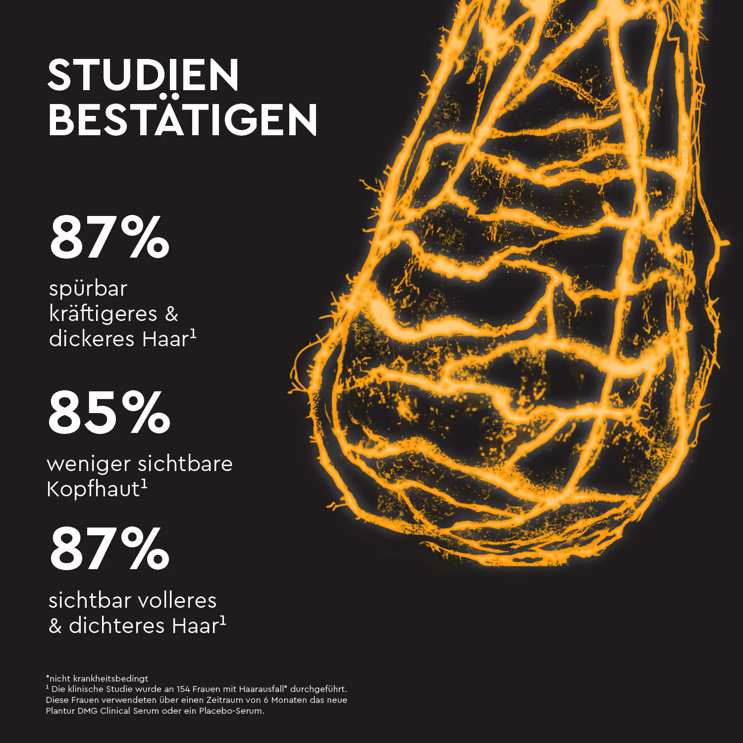 ¹ Die klinische Studie wurde an 154 Frauen mit Haarausfall* durchgeführt. Diese Frauen verwendeten über einen Zeitraum von 6 Monaten das neue Plantur DMG Clinical Serum oder ein Placebo-Serum.